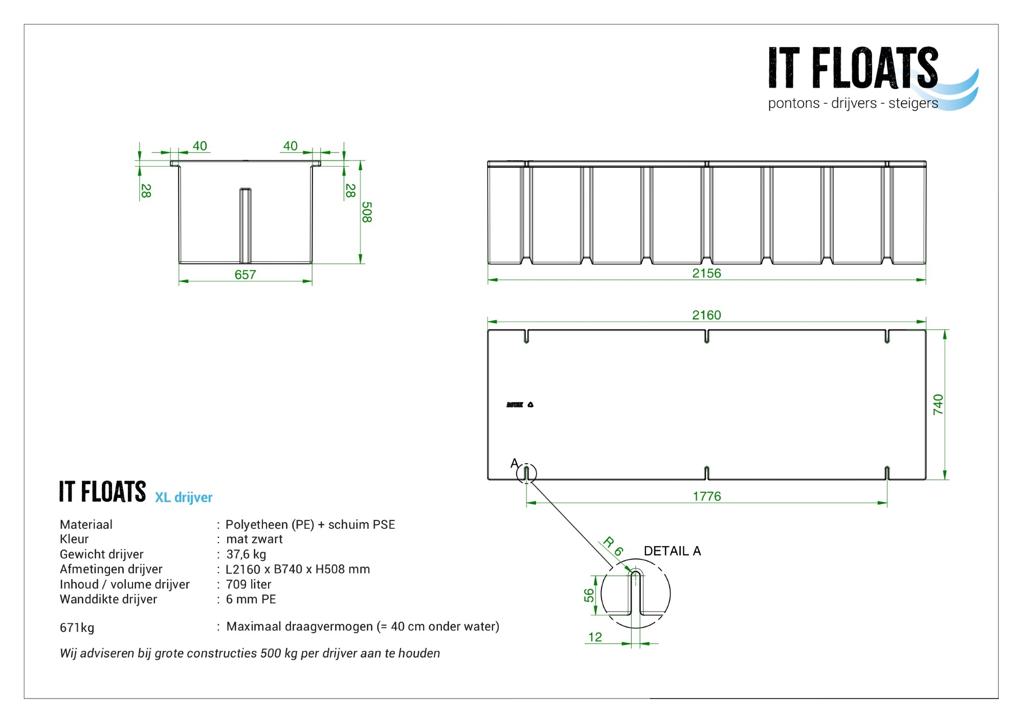 Wil je een drijvende constructie bouwen waar écht veel gewicht op komt te staan? Dan is de XL drijver de beste oplossing binnen ons assortiment. Met een inhoud van 709 liter en een maximaal draagvermogen van 671 kg per drijver is dit één van de grootste kunststof drijvers op de markt.